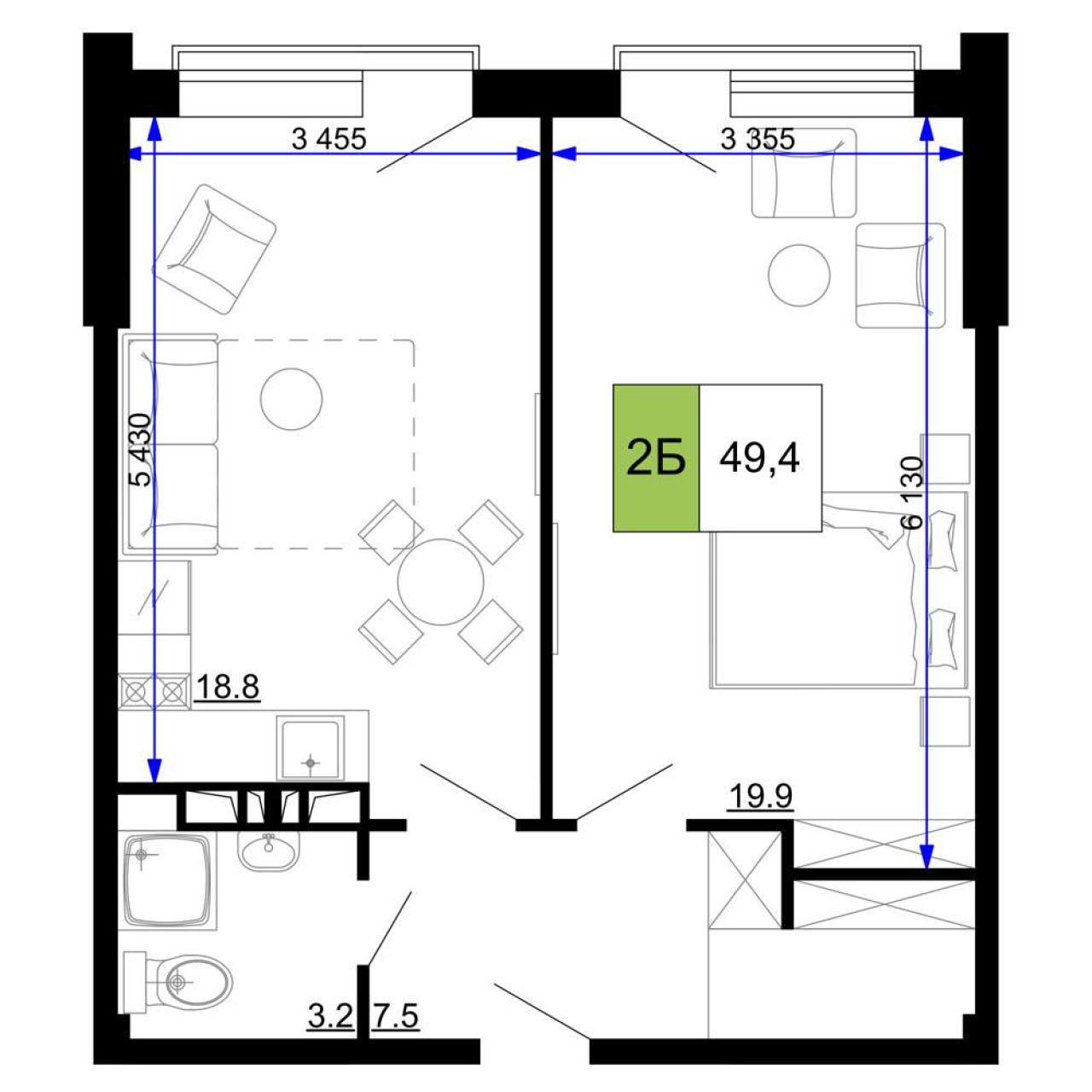 • Площадь объекта 49.4/19.9/18.8 м²