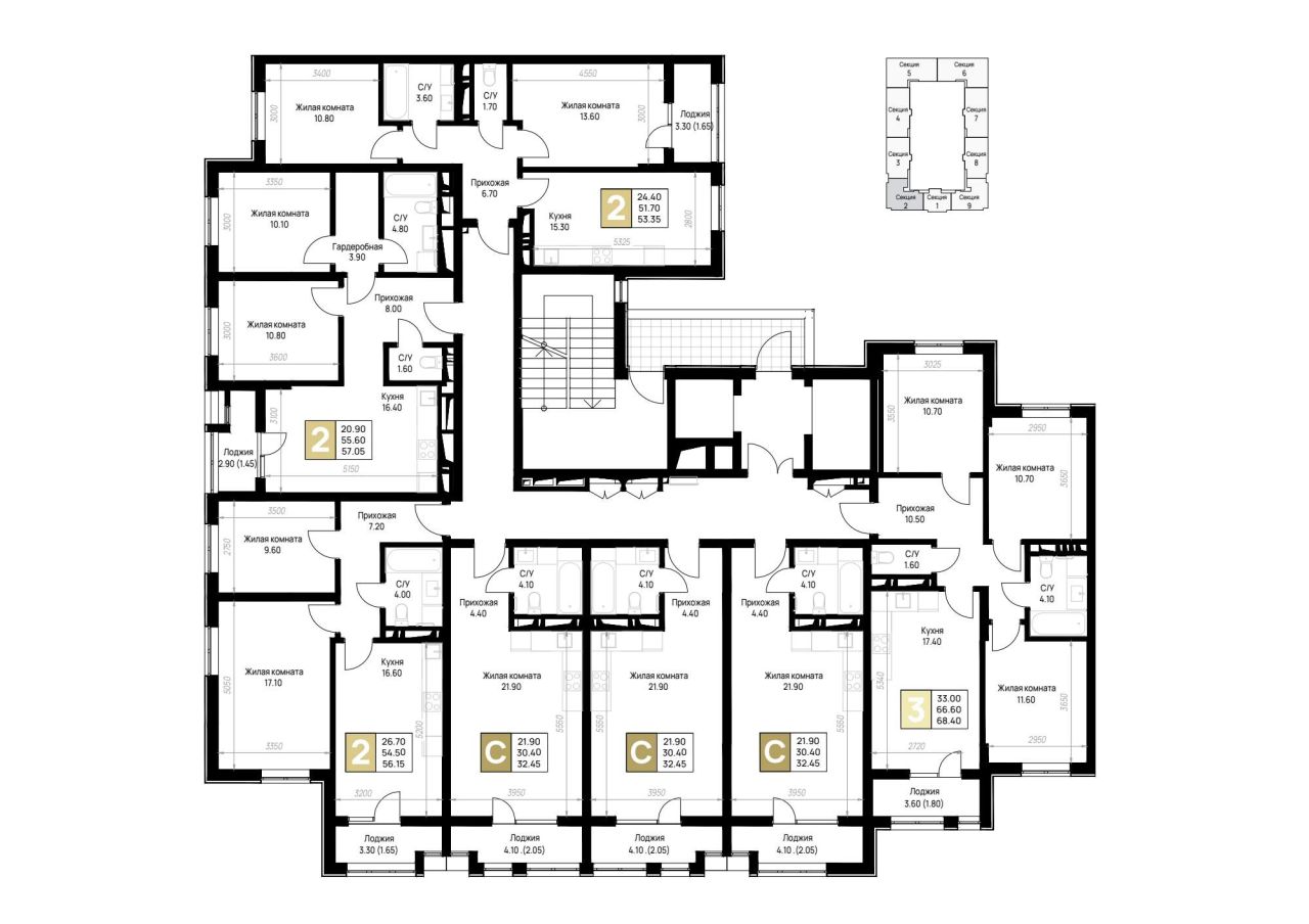 Жилая площадь 21.9 м2, предчистовая отделка, комнаты смежные.
