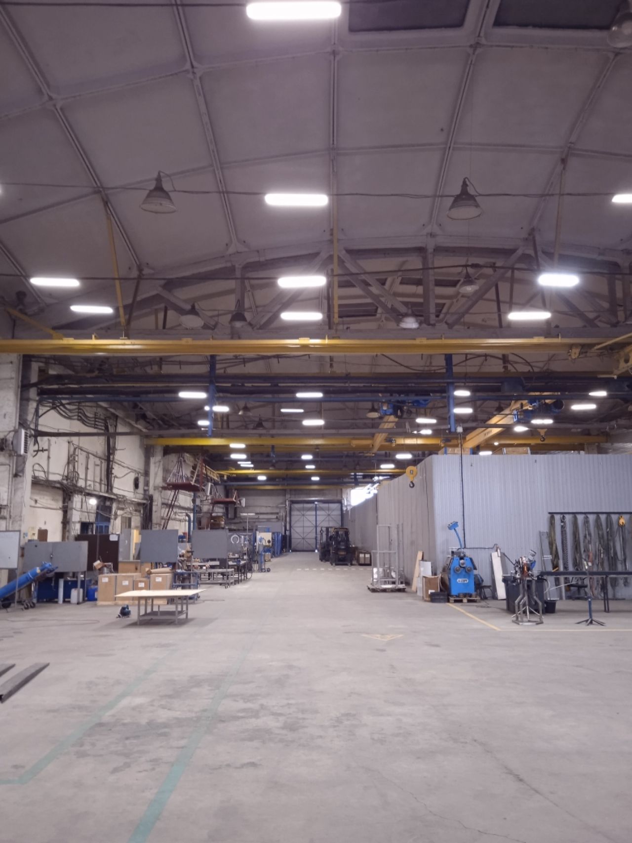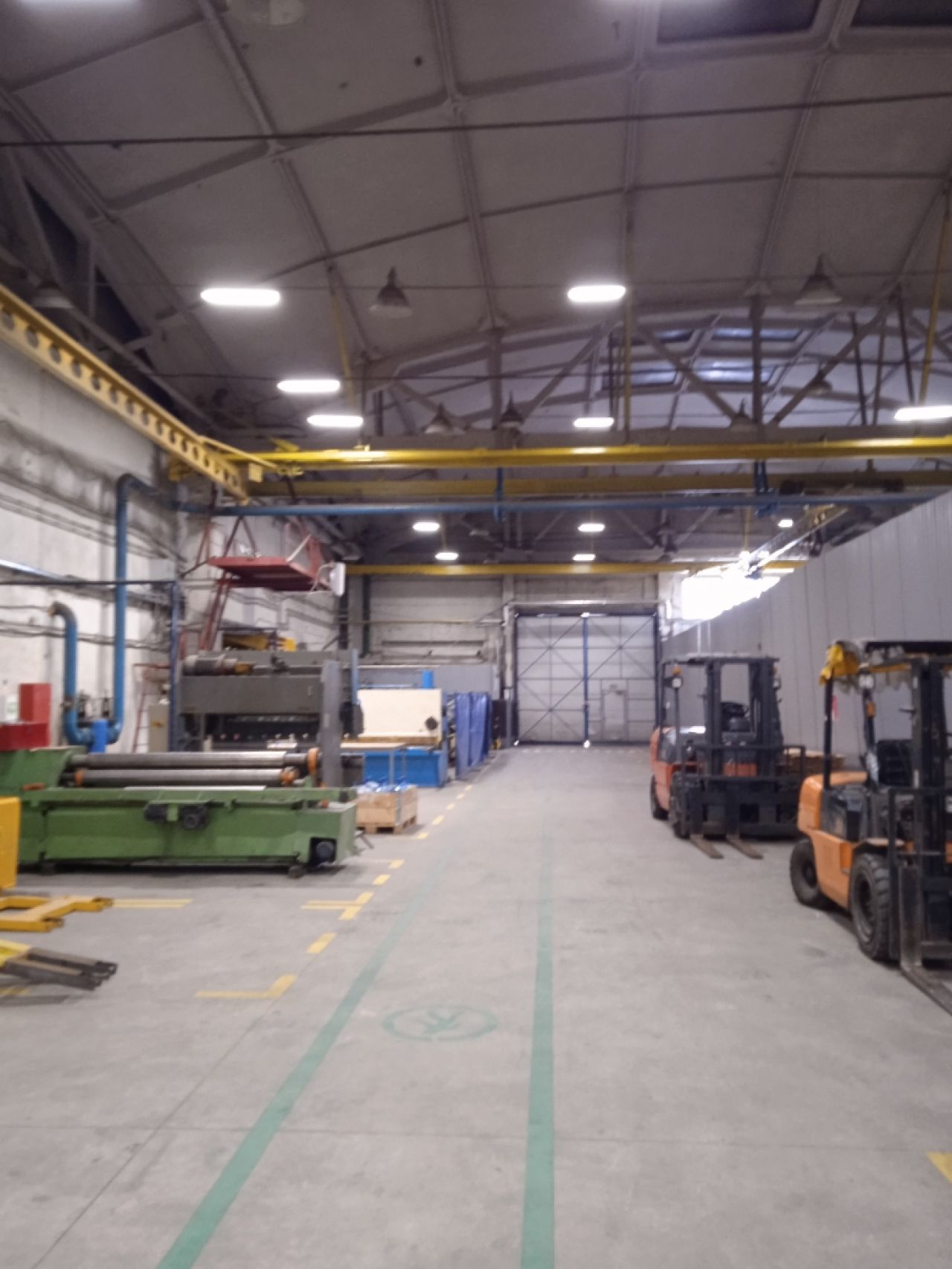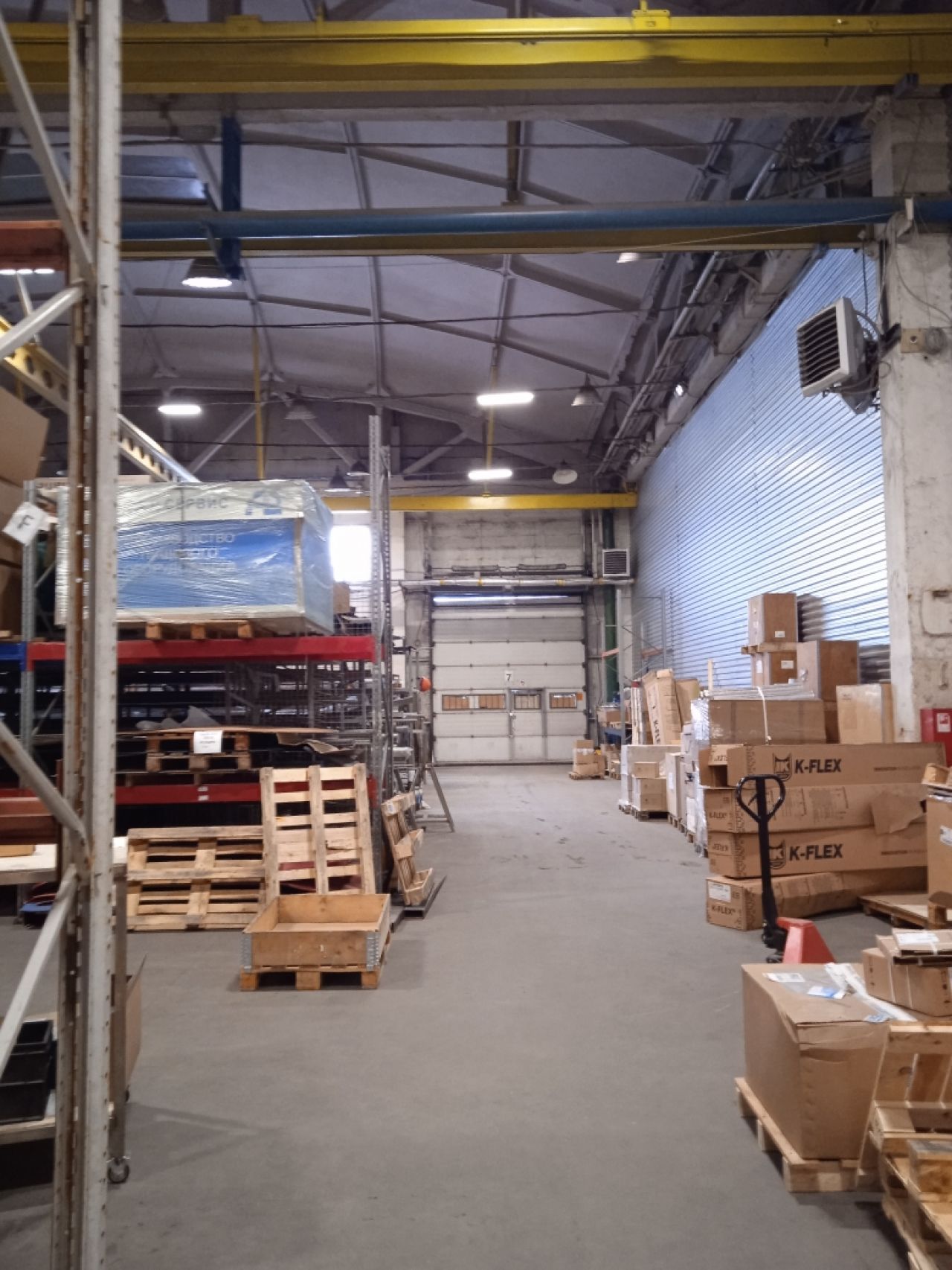 • Производственно-складское, теплое помещение, общей площадью 2850 кв.м. (из них 635 кв.м. административные, подсобные помещения – душ, с/у, раздевалки), шаг колонн 18*24, высота потолков 7-12 метров, автоматические роллерные ворота «HORMANN» с калиткой, под еврофуру размером 4,5 м (высота)*4 м (ширина) – 1 шт, распашные двустворчатые ворота размером 5.5 м – ширина*5,5м высота, тепловые завесы – 4 шт, кран-балки на 2 т. каждая в количестве 4 шт. (расположение кранбалок – поперек помещения, высота подъёма груза – 5 метров). Имеются водопровод, канализация, отопление. Полы выровненные, бетонная стяжка с антипылевым покрытием, нагрузка на пол – 5 тонн/кВ.м.