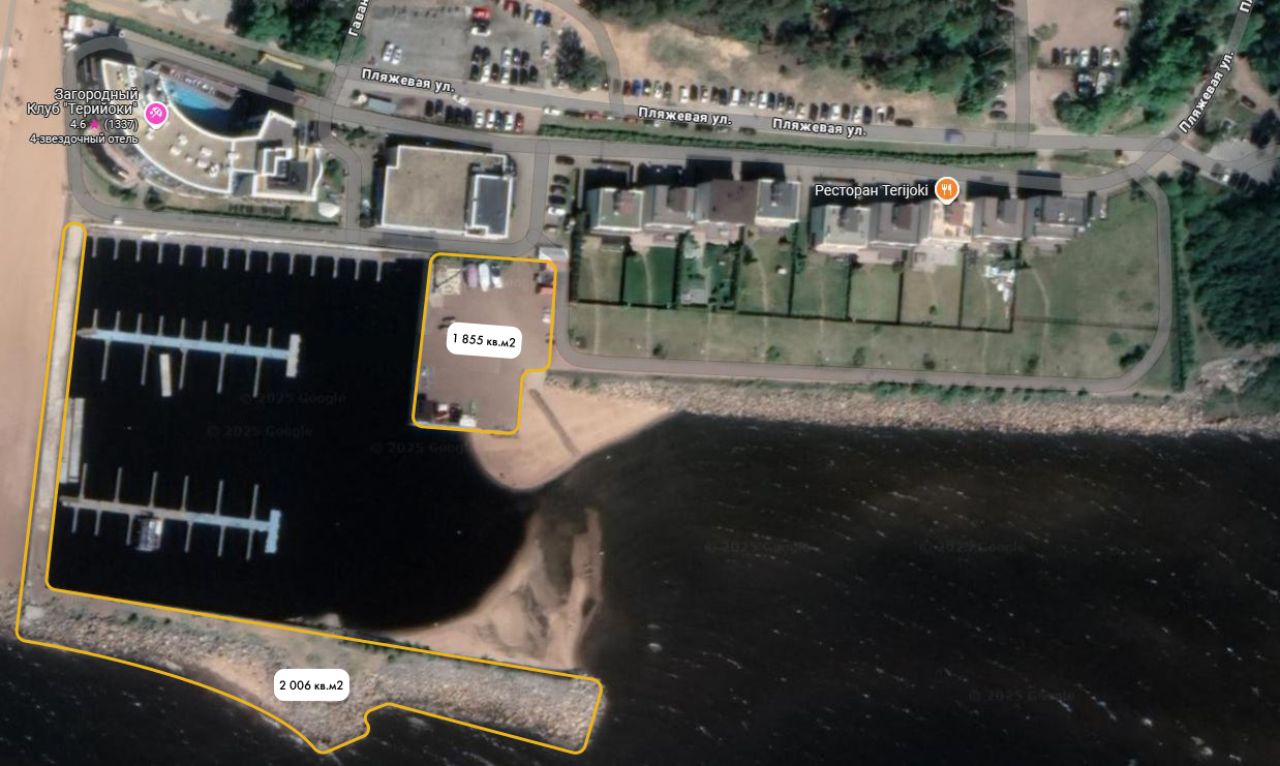 Продается имущественный комплекс, включающий право долгосрочной аренды земельных участков и оборудование для организации яхт-клуба, согласно перечню. Расположение на первой линии Финского залива в престижной локации Зеленогорска рядом с Золотым пляжем на территории загородного клуба Терийоки. В непосредственной близости расположено большое количество отелей, ресторанов, а также частных загородных резиденций. Участок состоит из двух частей 1 855 кв. м (кадастровый номер 78:38:22458:3) и 2 006 кв. м (кадастровый номер 78:38:22458:2), которые формируют марину – закрытое пространство с возможностью организации яхт-клуба. В локации есть высокий сформированный спрос на места для стоянки яхт как на летний, так и на зимний сезон. В стоимость входит имущество, необходимое для организации яхт-клуба: 1. Лодка «Буревестник-360» с мотором Ямаха 25 л.с. – 1 шт. 2. Несамоходное стоечное нефтеналивное судно «Терийоки» – 1 шт. 3. Навигационное оборудование (Плавучие буи) – 6шт 4. Металлоконструкция навигационный знак (Створный маяк) – 1 шт. 5. Понтонная система: – железобетонный понтон Neavy Dutym 2712, размер 11,95*2,7 м – 17 шт. – деревянный понтон, длина 92м – 1 шт. – трапы деревянные из сосны – 5 шт. – якорь 2,5 тн – 64 шт. – цепь оцинкованная диаметром 19мм 720 метров – причальный палец F 6000 – 23 шт. – причальный палец F 7500 – 15 шт. – причальный палец F 10500 – 11 шт. – причальный палец F 12000 – 5 шт. 6. Траверза 10.0тн для разгрузки судов – 1 шт. 7. Траверза прямая 10тн для разгрузки судов – 1 шт. 8. Кран для яхт Vermeer – 1 шт.