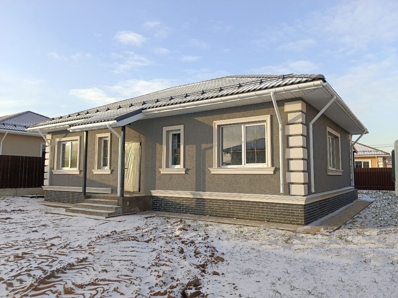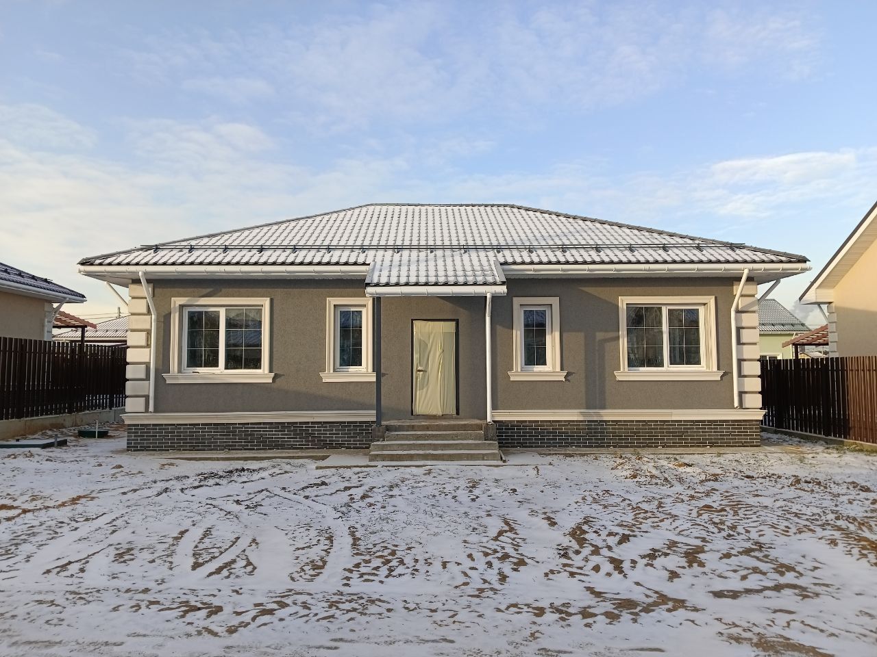 Новый 1-этажный коттедж 118,6 кв.м на участке 6 соток в КП «Новая Дятловка». Ключи – февраль 2025г. Завершается внешняя отделка фасада. Дом без внутренней отделки. Установлены межкомнатные перегородки. Выполнено утепление перекрытия. Семейная и IT ипотека - 6%. Планировка по проекту: Просторная кухня-гостиная 36 кв.м с окнами на три стороны света и панорамной дверью на крытую террасу 12 кв.м; три изолированные комнаты (12,1/14,5/14,4 кв.м), ванная комната, бойлерная, гардеробная, прихожая, гостевой с/у. Высокие потолки- 3 метра. Под кровлей можно оборудовать дополнительное помещение площадью от 18 до 30 кв.м с высотой до 1,8 м. Коммуникации: Электричество и магистральный газ заведены на участок, обустроены скважина и биостанция Топас С6 ПР(септик). Земельный участок: 6 соток, ровный. Забор - металлический штакетник 2м. Назначение - индивидуальное жилищное строительство. Прописка – д. Дятловка, г.о. Балашиха. Без проблем прикрепиться к садику, школе, поликлинике. Коттедж построен из высококачественных материалов с соблюдением всех технологий: - Фундамент: Свайный с ростверком (монолитный с армированием) с заглублением 3м; - Стены: Газобетонный блок Бонолит, толщина внешних стен 400мм; - Фасад: Штукатурка, покраска, фасадный декор; Цоколь утеплен и облицован термопанелями; выполнена отмостка; - Кровля: Четырехскатная из метало-черепицы с установкой снегозадержателей и водосточной системы; - Окна Melke: Металло-пластиковые двухкамерные стеклопакеты с поворотно-откидным механизмом; - Крыльцо с навесом; - Входная металлическая дверь. О поселке: Асфальтированные дороги. Общее освещение. Закрытая территория. В поселке оборудована детско-спортивная площадка с воркаутом и зоной отдыха, отдельной площадкой для малышей. Чистый и свежий воздух, удаленность от трасс и м