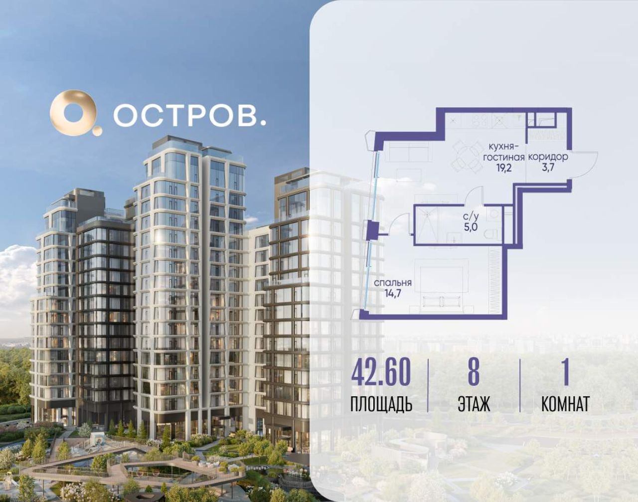 Продаётся 1-комн. квартира от застройщика: общая площадь 42.60 м, жилая 14.70 м, кухня 19.20 м, 19-й этаж, жилой квартал «Остров 12», корпус 3 (секция 1). Срок сдачи: 1 квартал...