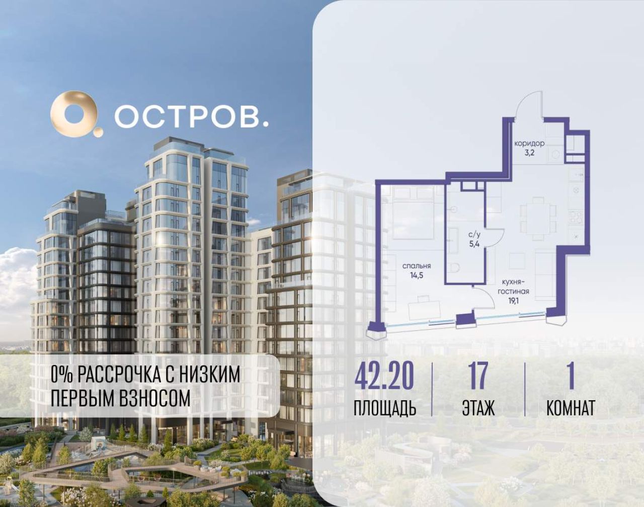 Продаётся 1-комн. квартира от застройщика: общая площадь 42.60 м, жилая 14.70 м, кухня 19.20 м, 19-й этаж, жилой квартал «Остров 12», корпус 3 (секция 1). Срок сдачи: 1 квартал...
