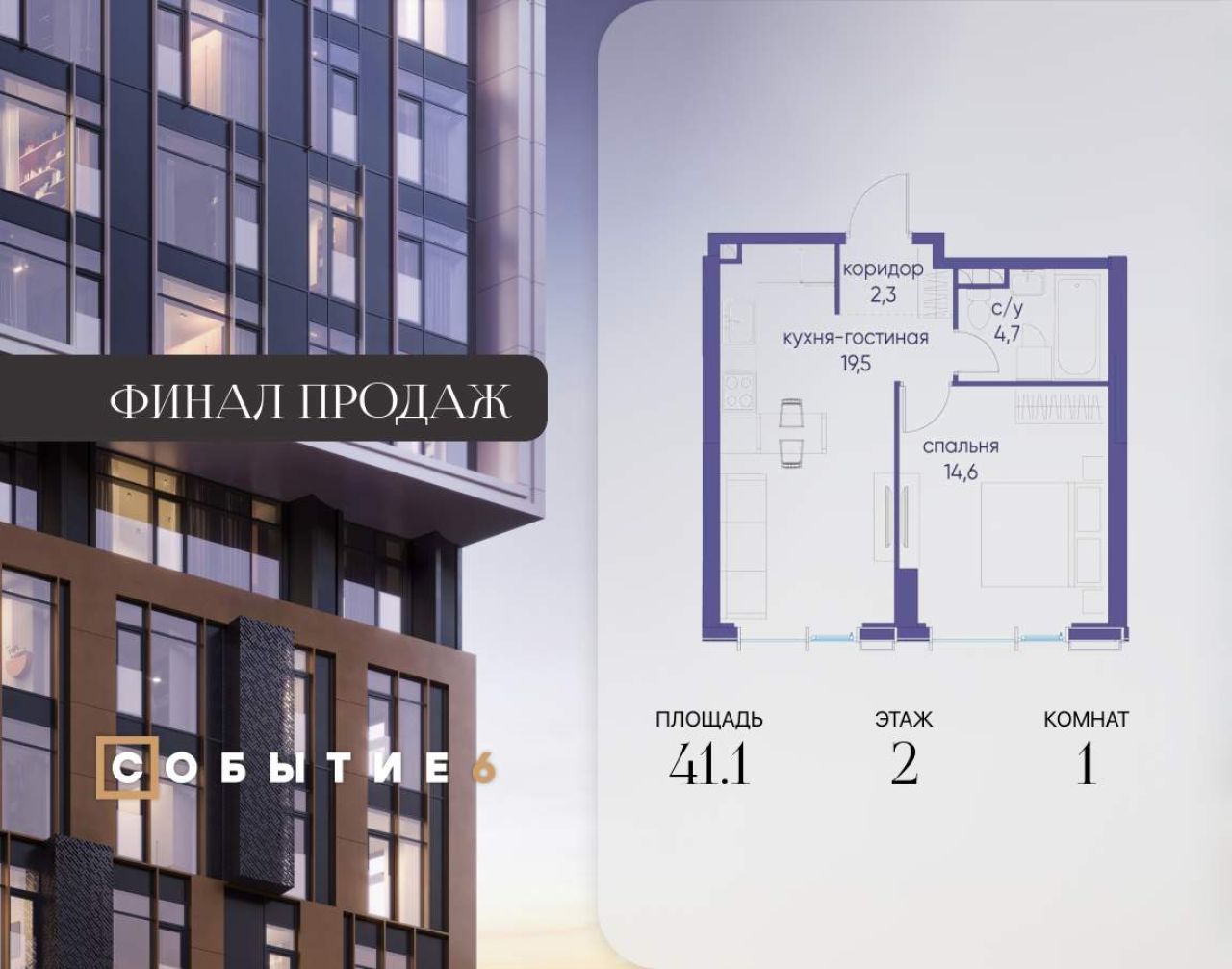 Продаётся 1-комнатная квартира от застройщика: общая площадь 41.60 м, жилая 14.90 м, кухня 18.80 м, 7-й этаж, жилой квартал «Событие-6», корпус 2 (секция 5) Срок сдачи: 1 квартал...
