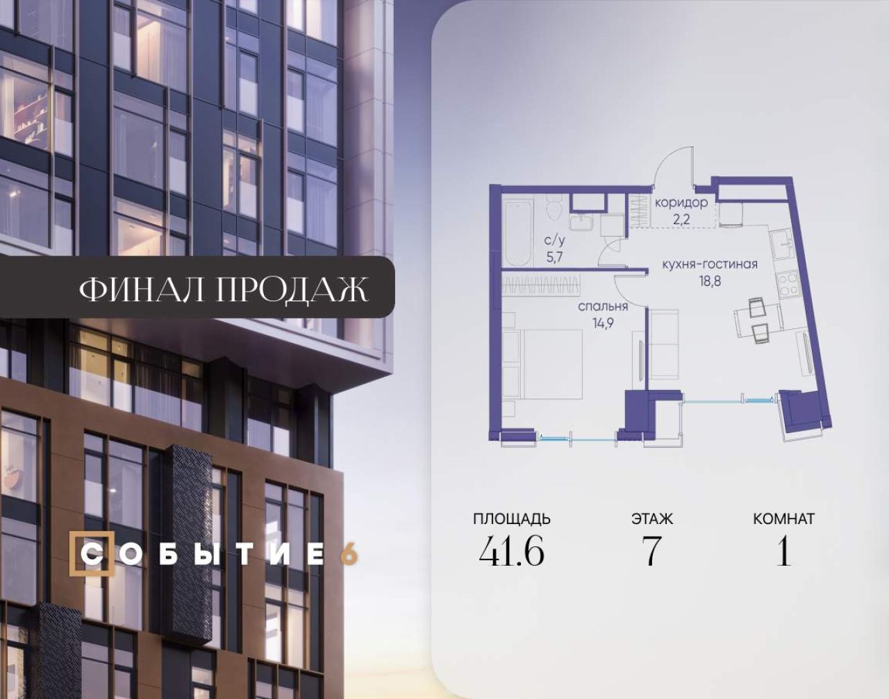 Продаётся 1-комнатная квартира от застройщика: общая площадь 41.60 м, жилая 14.90 м, кухня 18.80 м, 9-й этаж, жилой квартал «Событие-6», корпус 2 (секция 5) Срок сдачи: 1 квартал...