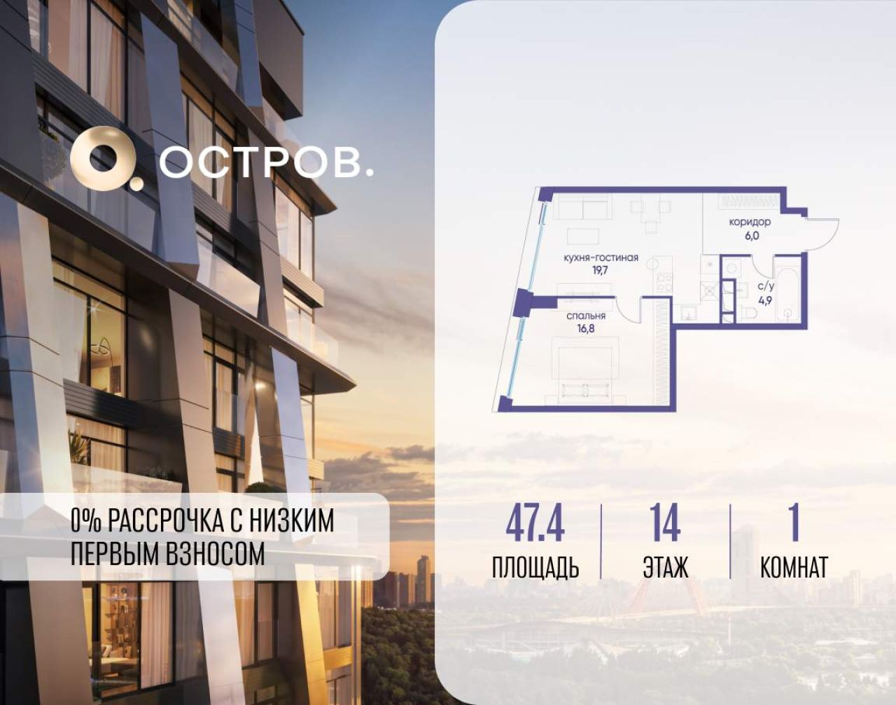 Продаётся 1-комн. квартира от застройщика: общая площадь 47.40 м, жилая 14.40 м, кухня 21.60 м, 10-й этаж, жилой квартал «Остров 12», корпус 1 (секция 1). Срок сдачи: 1 квартал...