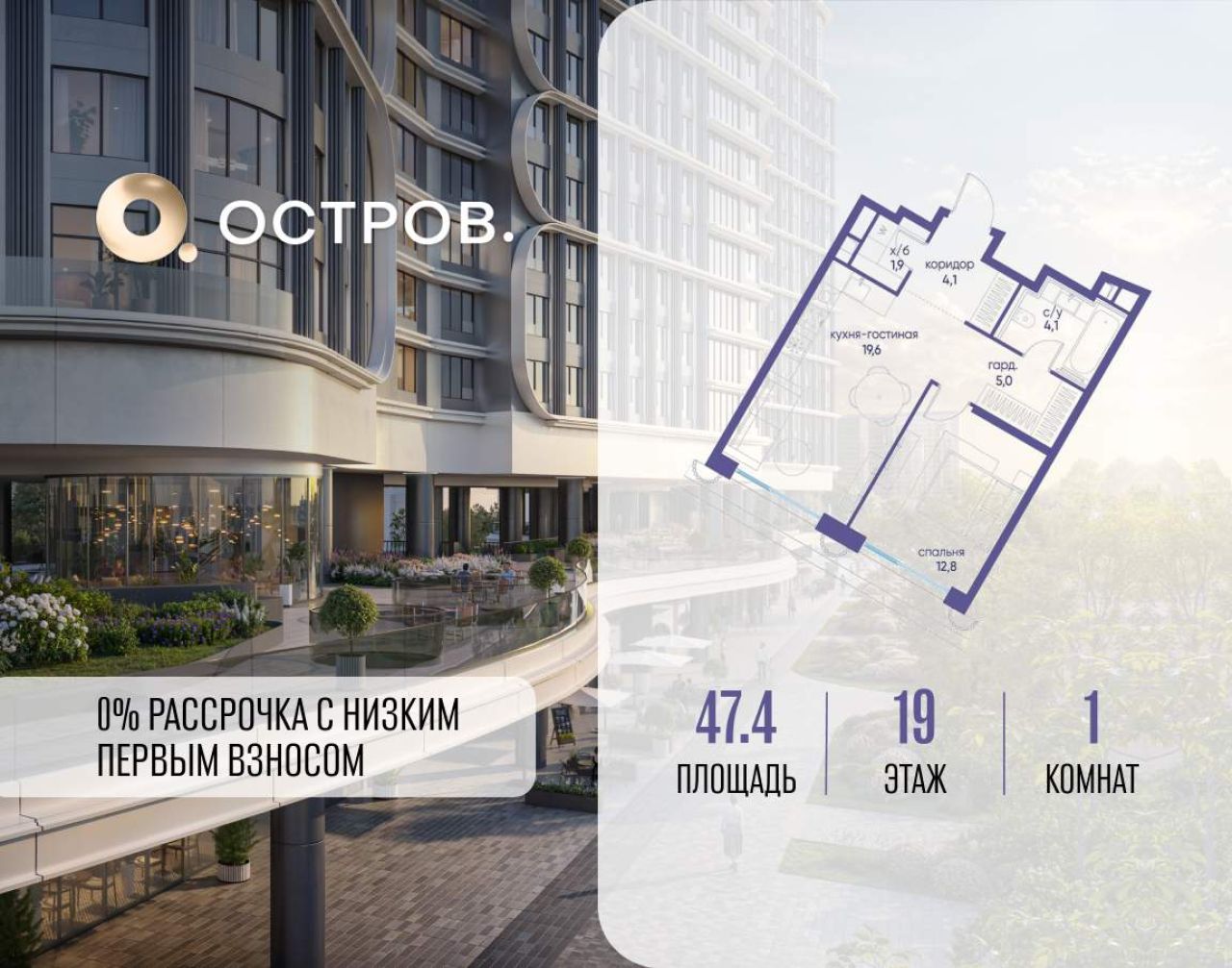 Продаётся 1-комн. квартира от застройщика: общая площадь 47.40 м, жилая 16.80 м, кухня 18.70 м, 14-й этаж, жилой квартал «Остров 12», корпус 1 (секция 2). Срок сдачи: 1 квартал...