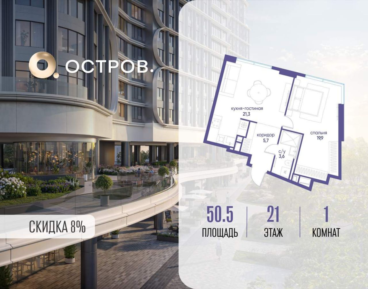 Продаётся 1-комн. квартира от застройщика: общая площадь 50.00 м, жилая 17.50 м, кухня 23.30 м, 17-й этаж, жилой квартал «Остров 7», корпус 7 (секция 2). Срок сдачи: 3 квартал...