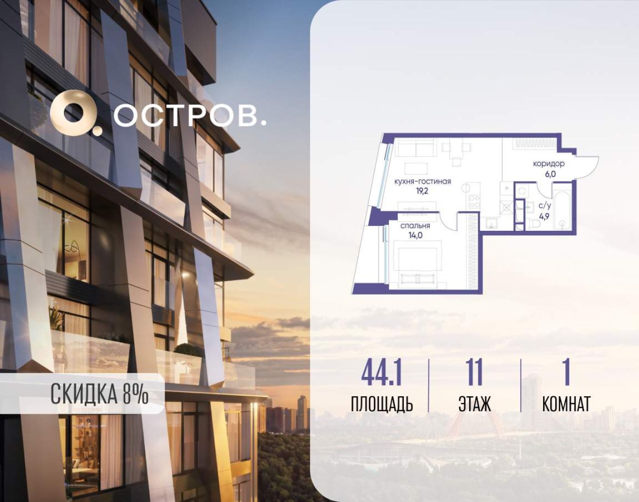 Продаётся 1-комн. квартира от застройщика: общая площадь 42.60 м, жилая 14.70 м, кухня 19.20 м, 19-й этаж, жилой квартал «Остров 12», корпус 3 (секция 1). Срок сдачи: 1 квартал...