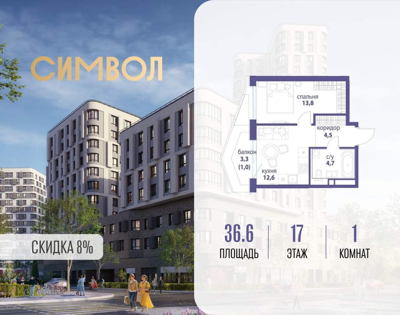 Продается 1-комнатная квартира от застройщика: общая площадь 35.60 м, жилая 13.80 м, кухня 12.60 м, 24-й этаж, жилой квартал «Вдохновение», корпус 33 (секция 3). Срок сдачи: 4...