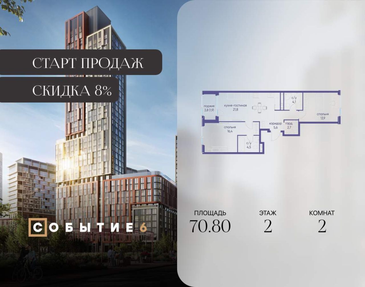 Продаётся 2-комнатная квартира от застройщика: общая площадь 64.60 м, жилая 26.80 м, кухня 20.70 м, 17-й этаж, жилой квартал «Событие-6», корпус 2 (секция 5) Срок сдачи: 1 квартал...
