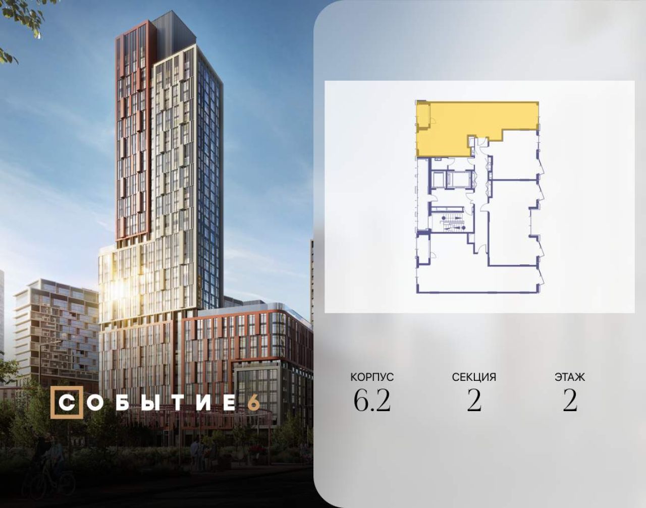 Продаётся 2-комнатная квартира от застройщика: общая площадь 61.90 м, жилая 33.00 м, кухня 17.80 м, 35-й этаж, жилой квартал «Событие-6», корпус 2 (секция 5) Срок сдачи: 1 квартал...