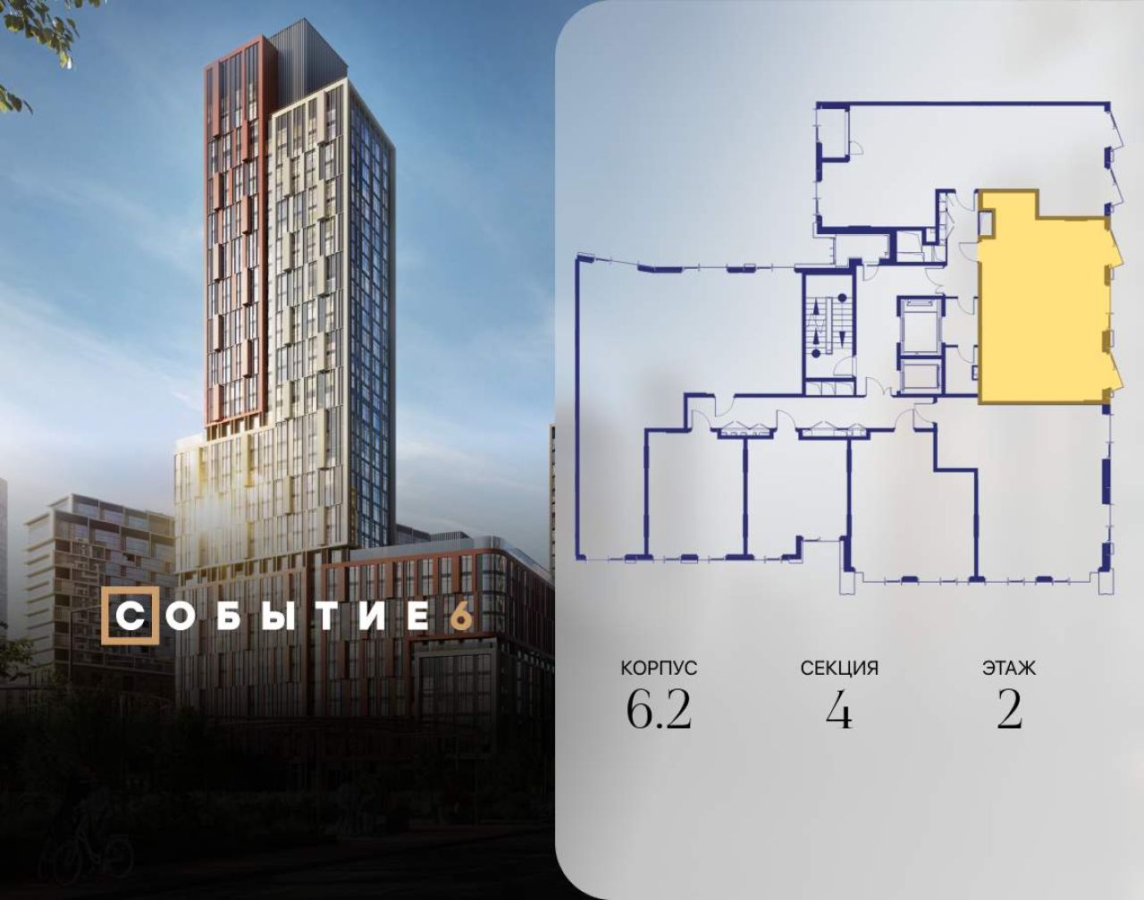 Продаётся 2-комнатная квартира от застройщика: общая площадь 61.90 м, жилая 33.00 м, кухня 17.80 м, 35-й этаж, жилой квартал «Событие-6», корпус 2 (секция 5) Срок сдачи: 1 квартал...