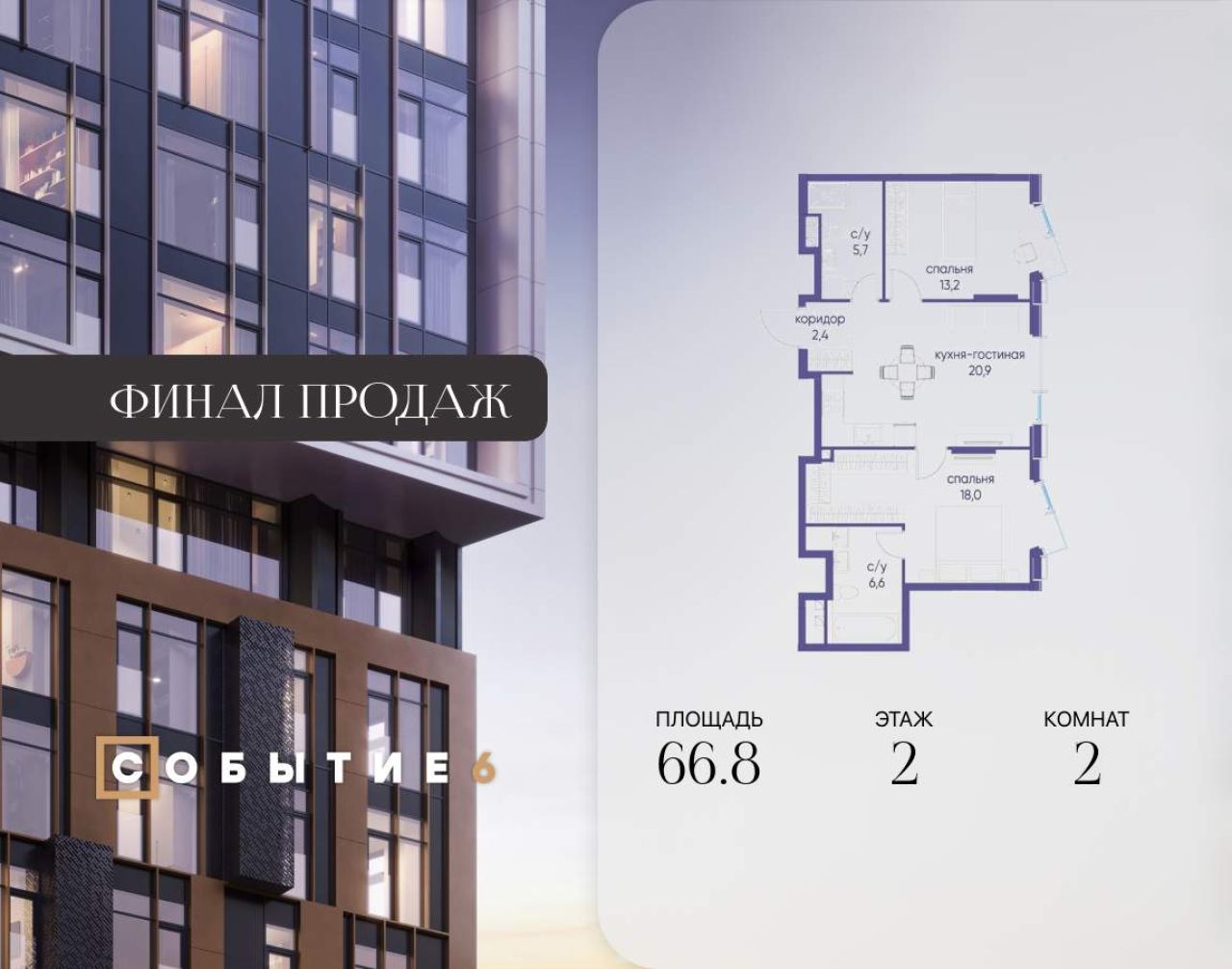 Продаётся 2-комнатная квартира от застройщика: общая площадь 61.80 м, жилая 32.90 м, кухня 17.80 м, 25-й этаж, жилой квартал «Событие-6», корпус 2 (секция 5) Срок сдачи: 1 квартал...