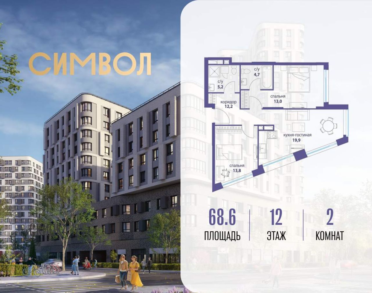 Продается 2-комнатная квартира от застройщика: общая площадь 69.80 м, жилая 36.60 м, кухня 18.20 м, 19-й этаж, жилой квартал «Вдохновение», корпус 34 (секция 1). Срок сдачи: 4...