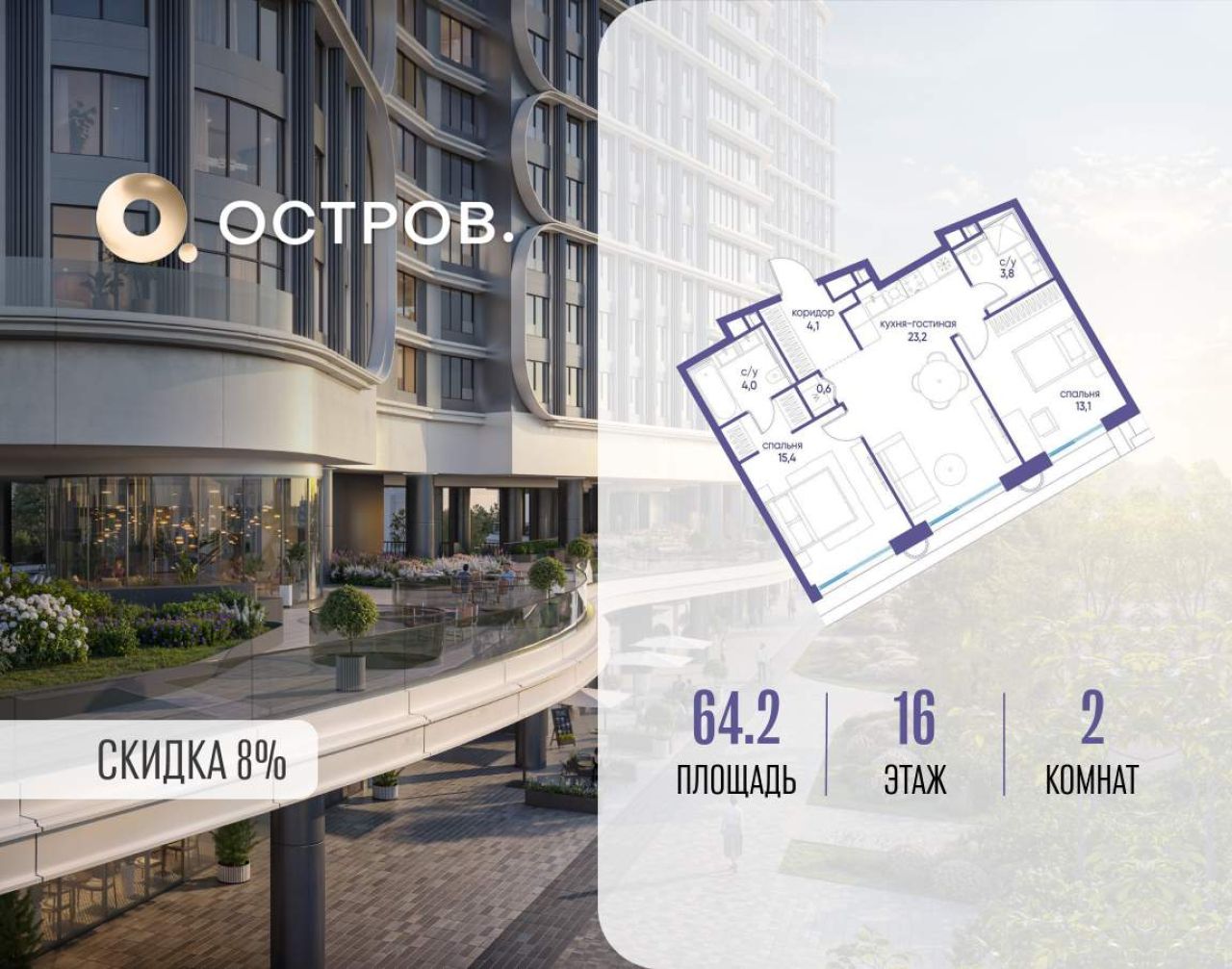 Продаётся 2-комн. квартира от застройщика: общая площадь 64.50 м, жилая 28.80 м, кухня 24.80 м, 18-й этаж, жилой квартал «Остров 7», корпус 7 (секция 1). Срок сдачи: 3 квартал...