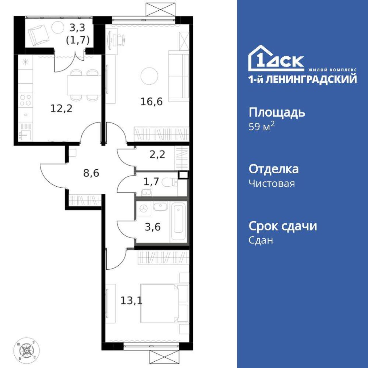 Продается 2-комн. квартира, площадью 59.4 кв.м. Жилая площадь 29.7 м2, кухня 12.2 кв. м, ремонта нет, окна выходят во двор и на улицу. Квартира располагается на 13 этаже...