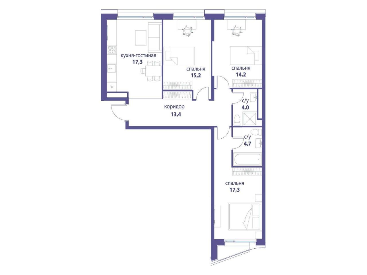 Продается 3-комнатная квартира от застройщика: общая площадь 80.00 м, жилая 24.70 м, кухня 28.80 м, 17-й этаж, жилой квартал «Вдохновение», корпус 32 (секция 1). Срок сдачи: 4...
