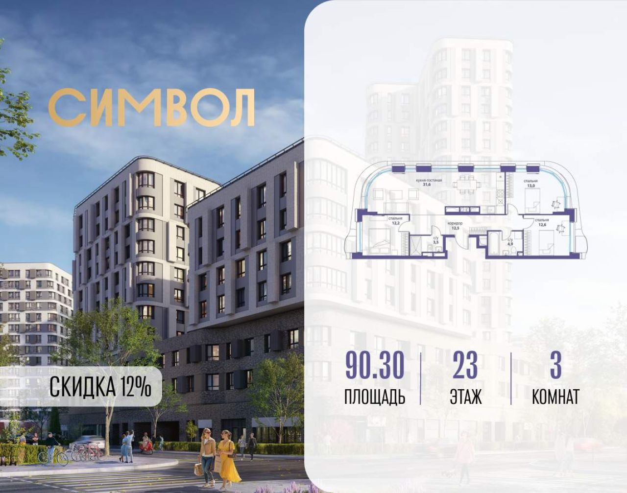 Продается 3-комнатная квартира от застройщика: общая площадь 90.30 м, жилая 37.80 м, кухня 31.60 м, 22-й этаж, жилой квартал «Вдохновение», корпус 34 (секция 1). Срок сдачи: 4...