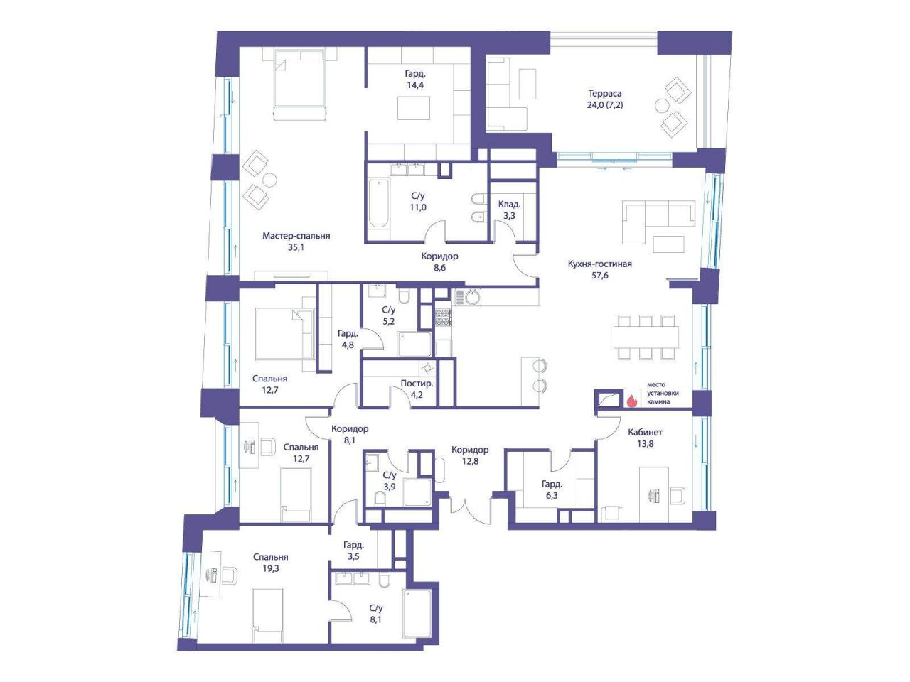 Продается просторная квартира площадью 219.00 м2 в жилом комплексе РЕКА. Квартира находится в 4 секции корпуса 3 (будет введен в эксплуатацию в 4 кв. 2026). Этаж 12-й из 14. В...
