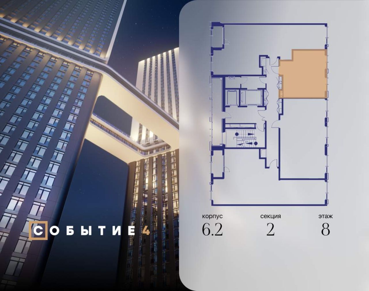 Продаётся 2-комнатная квартира от застройщика: общая площадь 61.40 м, жилая 31.60 м, кухня 16.90 м, 8-й этаж, жилой квартал «Событие-6», корпус 2 (секция 3) Срок сдачи: 1 квартал...