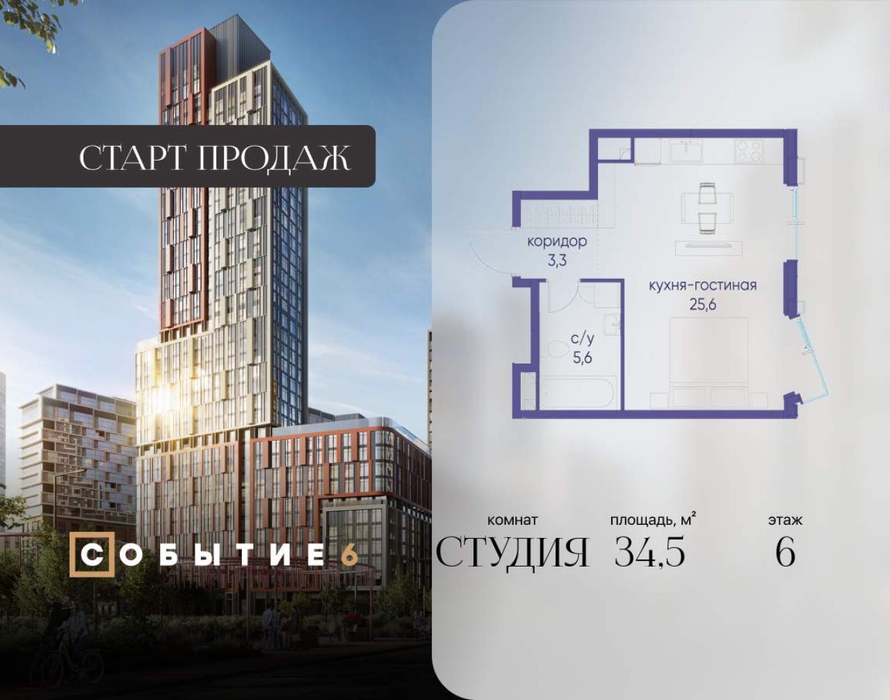 Продаётся квартира-студия от застройщика: общая площадь 33.70 м, жилая 19.80 м, кухня 5.00 м, 5-й этаж, жилой квартал «Событие-6», корпус 2 (секция 2) Срок сдачи: 1 квартал 2029...