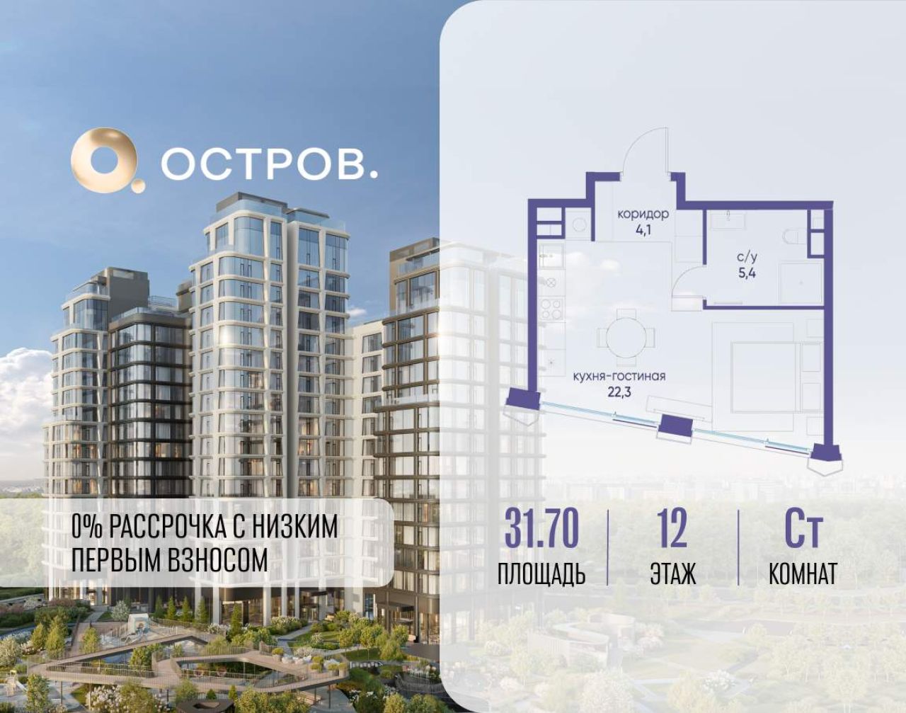 Продаётся квартира от застройщика: общая площадь 31.70 м, жилая 17.30 м, кухня 5.00 м, 13-й этаж, жилой квартал «Остров 12», корпус 2 (секция 1). Срок сдачи: 1 квартал 2029 года...