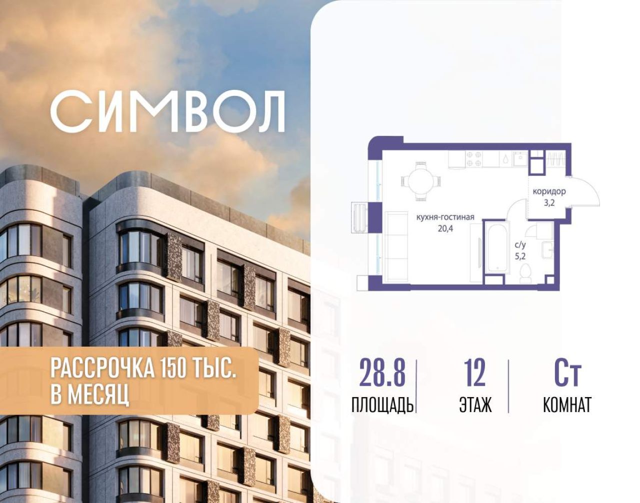 Продается квартира-студия от застройщика: общая площадь 28.80 м, жилая 10.00 м, кухня 10.40 м, 14-й этаж, жилой квартал «Гордость», корпус 36 (секция 5). Срок сдачи: 2 квартал...