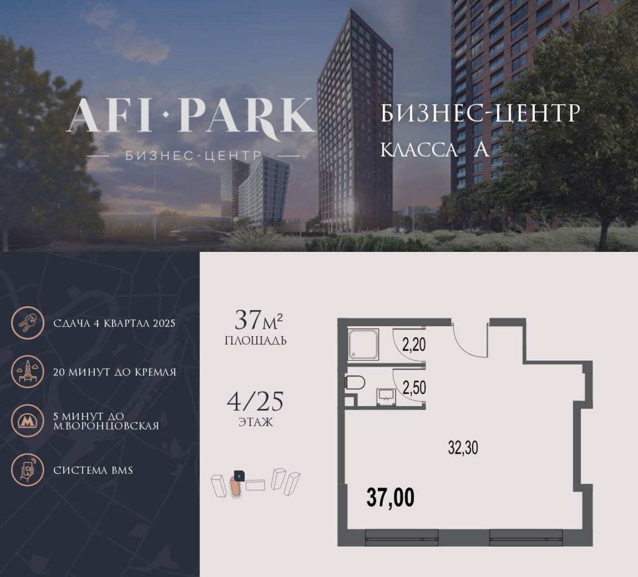 Продается просторное коммерческое помещение общей площадью 29,6 м2 на 4 этаже в строящемся бизнес-центре AFI Park. 21-этажный бизнес-центр AFI Park - современный бизнес-центр...